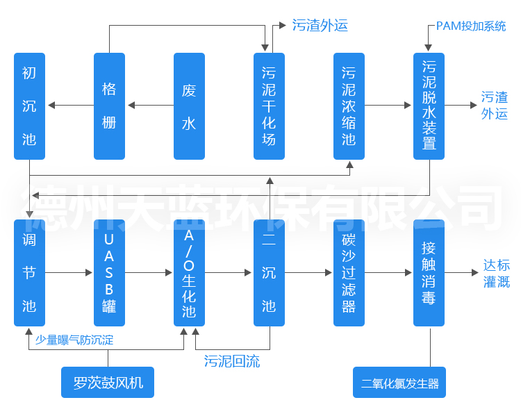 因此厭氧—好氧串聯(lián)工藝在能耗、投資、處理成本和治理效果方面都具有大的優(yōu)越性。我們根據(jù)廢水的水質(zhì)特點(diǎn)及養(yǎng)殖場具體條件,結(jié)合多項(xiàng)工程的成功經(jīng)驗(yàn),本著投資省、運(yùn)行費(fèi)用低、操作管理方便的原則,確定了“初沉+調(diào)節(jié)+UASB+A/O+二沉”處理工藝。