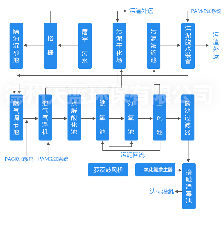 污水先經(jīng)格柵去除大顆粒垃圾雜物后進(jìn)入隔油池,去除大部分油脂,油水分離。后再進(jìn)入曝氣調(diào)節(jié)池,污水經(jīng)由提升泵提升至高效溶氣氣浮機(jī),污水在PAC、PAM的作用下進(jìn)一步去除污水中的SS后自流進(jìn)入中間水池,中間水池內(nèi)的污水經(jīng)由中間水泵提升至厭氧池,廢水在本單元中進(jìn)行水解、酸化等一系列厭氧反應(yīng),其目的是將大分子量的蛋白質(zhì)等有機(jī)污染物分解成分子量小的有機(jī)物,以利于下一級(jí)單元的好氧生化處理。厭氧池出水進(jìn)入缺氧池,進(jìn)行反硝化,降低有機(jī)物濃度,通過(guò)硝化液的回流,去除污水中的總氮,并提高氨氮的去除率。缺氧池出水進(jìn)入接觸氧化池,內(nèi)設(shè)填料,增加污水與好氧微生物的接觸面積,使污水中的有機(jī)物等大幅降低。經(jīng)好氧處理后的污水自流進(jìn)入二沉池進(jìn)行泥水分離,上清液進(jìn)入消毒池,經(jīng)二氧化氯發(fā)生器消毒后達(dá)標(biāo)排放。