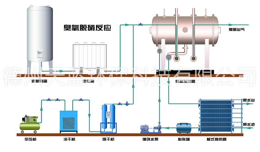 脫硝過程是利用氧化性很強(qiáng)的臭氧氣體將煙氣中的NO轉(zhuǎn)換為易溶于水的NOx,產(chǎn)物在后級(jí)吸收塔中被吸收。因此脫硝過程不產(chǎn)生直接的副產(chǎn)物。