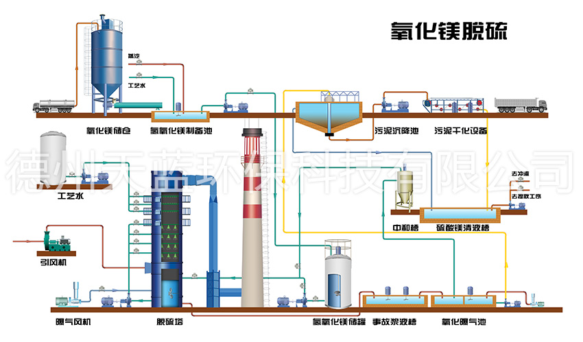 是將落入塔底的吸收液經(jīng)漿液循環(huán)泵重新輸送至吸收塔上部吸收區(qū)。塔底吸收液pH由自動噴注的20%氫氧化鎂漿液調(diào)整,而且與酸堿計連鎖控制。當(dāng)塔底漿液pH低于設(shè)定值時,氫氧化鎂漿液通過輸送泵自動補(bǔ)充到吸收塔底,在塔底攪拌器的作用下使?jié){液混合均勻,至pH達(dá)到設(shè)定值時停止補(bǔ)充氫氧化鎂漿液。20%氫氧化鎂溶液由氧化鎂粉加熱水熟化產(chǎn)生,或直接使用氫氧化鎂,因為氧化鎂粉不純,而且氫氧化鎂溶解度很低,就使得熟化后的漿液非常易于沉積,因此攪拌機(jī)與氫氧化鎂溶液輸送泵必須連續(xù)運(yùn)轉(zhuǎn),避免管線與吸收塔底部產(chǎn)生沉淀。