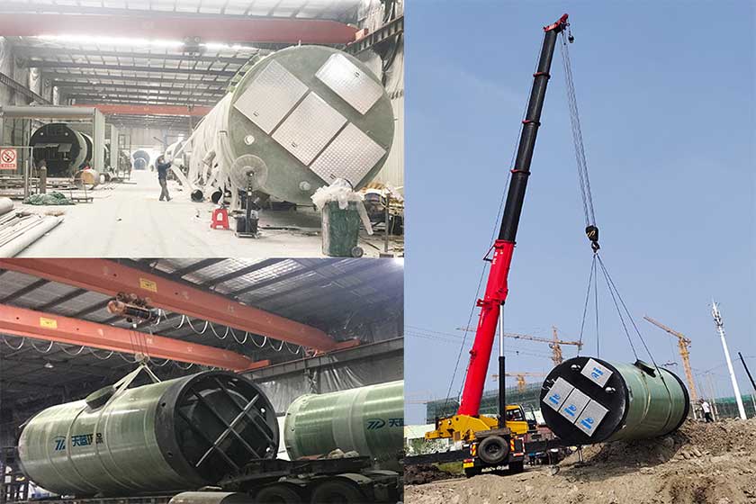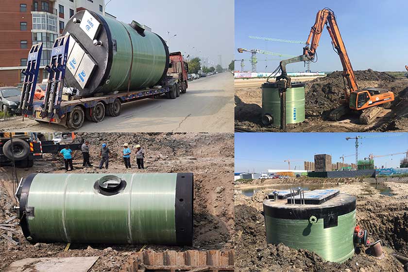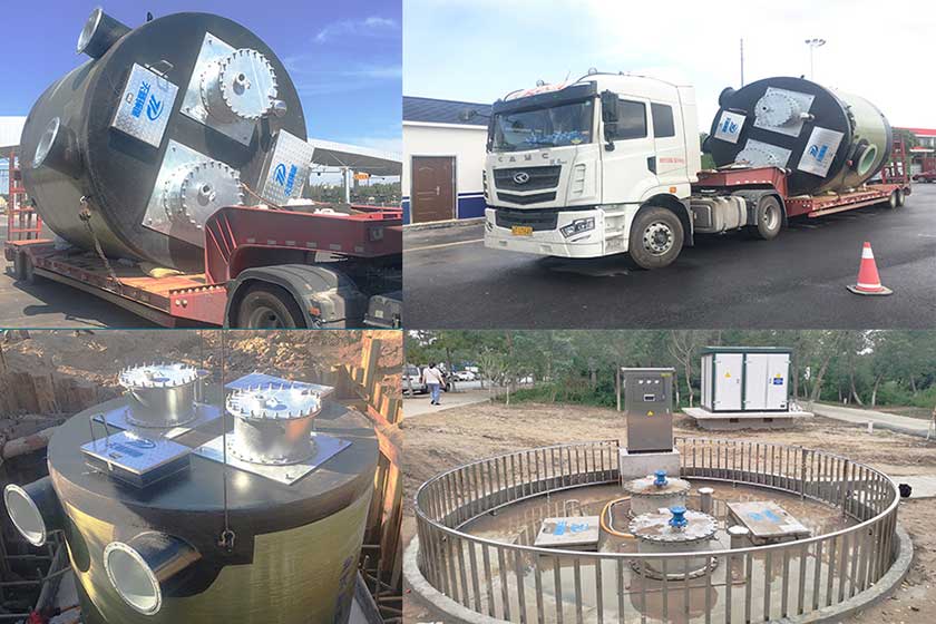 ? 筒體吊裝時(shí)筒體的進(jìn)出口方向應(yīng)與進(jìn)出水管方向一致。管道連接應(yīng)在泵站進(jìn)出水管加柔性接頭。